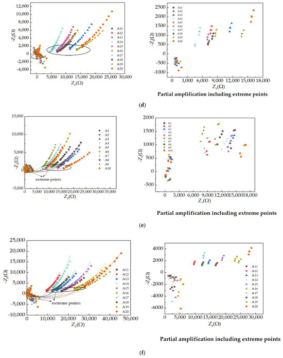 The AC impedance spectrum curves of concrete-filled steel tubes: (a) with a single rust inhibitor, before salt erosion; (b) with assembly unit of rust inhibitor, before salt erosion; (c) with a single rust inhibitor, after NaCl F-C; (d) with assembly unit of rust inhibitor, after NaCl F-C; (e) with a single rust inhibitor, after NaCl D-A; (f) with assembly unit of rust inhibitors, after NaCl D-A.