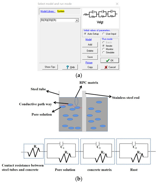 The equivalent circuits of concrete-filled steel tubes: (a) the equivalent circuits in impedance spectrum fitting software ZSimpWin; (b) detailed images of the equivalent circuits.