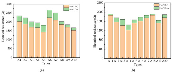 The electrical resistance of concrete-filled steel tubes is illustrated in Figure 4. It can be observed from Figure 4 that before NaCl action, electrical resistance increases with the increasing dosages of benzotriazole and sodium molybdate, as benzotriazole forms an adsorption film at the interface between the steel pipe and concrete in the concrete-filled steel pipes [29]. The adsorption film prevents the migration of electrons in the steel pipe and pore solution ions in the concrete, resulting in a decrease in the conductivity of the concrete-filled steel pipes. Sodium molybdate makes the passivation film more dense, causing a decrease in electron and ion migration and an increase in electrical resistance. The concrete-filled steel tube with 5 kg/m3 Na2MoO4 and 15 kg/m3 benzotriazole had the highest electrical resistance. An increase in the number of NaCl F-C and NaCl D-A led to an increase in the electrical resistance of the concrete-filled steel tubes. This is due to the increased rust on the surface of the steel tube induced by the NaCl action, which blocks the migration of electrons and free ions. With the increase in the number of NaCl F-C and NaCl D-A actions, the electrical resistance of the concrete-filled steel tubes decreased with the addition of benzotriazole and sodium molybdate. This is because benzotriazole and sodium molybdate can improve the rust resistance of steel pipes, thereby reducing the rust stains on the steel. As the rust on steel reduced its electrical conductivity, the decrease in the electrical conductivity of concrete-filled steel pipes slowed down [30,31]. Thus, the electrical resistance of the concrete-filled steel tubes after undergoing the NaCl action decreased by adding benzotriazole and sodium molybdate.