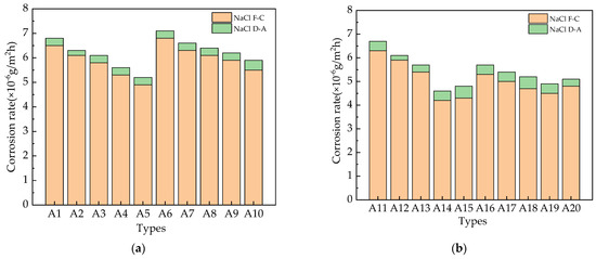 The mass loss rates of steel tubes: (a) with a single rust inhibitor, after NaCl F-C; (b) with an assembly unit of rust inhibitors, after NaCl F-C; (c) with a single rust inhibitor, after NaCl D-A; (d) with an assembly unit of blended rust inhibitors, after NaCl D-A.