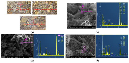 The SEM-EDS of rust on the surface of the steel tubes: (a) micrographs of samples; (b) A10, after 300 NaCl F-C; (c) A10, after 30 NaCl D-A; (d) A14, after 30 NaCl D-A.