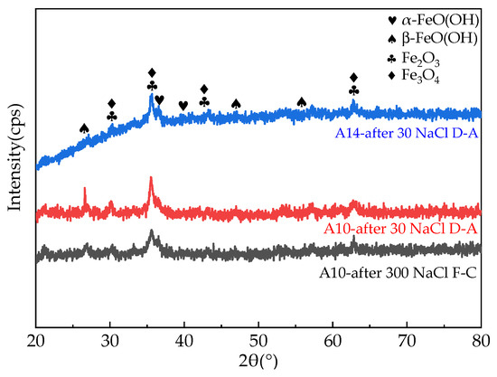 The XRD curves of the rust on the surface of the steel tubes are exhibited in Figure 11. The rust consisted of α-FeO(OH), β-FeO(OH), Fe2O3, and Fe3O4. A higher number of Fe2O3 and Fe3O4 crystals were observed after 30 NaCl D-A than after 300 NaCl F-C. NaCl F-C and NaCl D-A can accelerate the rate at which chloride ions damage the passivation film on the surface of the steel, thereby accelerating the corrosion of iron, resulting in the formation of crystals such as α-FeO(OH), β-FeO(OH), Fe2O3, and Fe3O4. The corrosion effect of 30 NaCl D-A on the passivation film was more serious than that of 300 NaCl F-C. The Fe2O3 and Fe3O4 concentrations in the specimens with the assembly unit of 5 kg/m3 Na2MoO4 and 15 kg/m3 benzotriazole were the lowest.