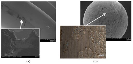 To advance and understand the lubrication effect of graphene platelet-based dry lubricants, the bearings were analyzed via scanning electron microscopy (SEM) and Raman spectrometry. In addition to this, microtribological studies were performed to determine the effects acting on the angular contact ball bearings. Figure 1 illustrates the SEM images of the raceway and a bearing ball after testing on a rig (1.3 million cycles tested under 48% degree of reciprocating motion), with detailed information available in [12]. A thin, dry lubricant film based on graphene platelets formed on the surface. On the counterpart, including the ball itself and the outer bearing ring, a transfer film developed, resulting in low friction and prolonged running time. The hardness was assessed using a Hysitron/Bruker nanoindenter (TriboIndenter TI 950, Bruker Corporation, Billerica, MA, USA) as described in [27]. Prior to the test, the hardness of the uncoated bearing surface was 9.2 GPa; after the pivoting test, the hardness of the raceway dropped to 7.3 GPa. The hardness of the accumulated graphene platelets was approximately 0.3 GPa.