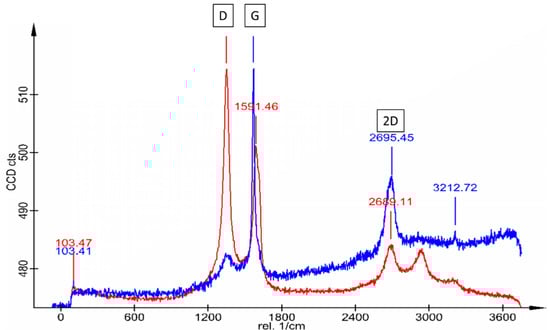Furthermore, the graphene layers underwent examination using Raman spectroscopy (Figure 2). For the measurement, an alpha300 RA Raman-AFM microscope was used (Oxford Instruments, Abingdon, UK). The 2D peak around 2690 cm−1, with a half-width of 105 cm−1 (half-width of the monolayer ≈ 24 cm−1), indicates stacked graphene. The measurement before and after exposure reveals a distinct G peak at 1591 cm−1, typical for graphene, which splits into the G and two D peaks when it has defects. The intensity of the D peak at 1351 cm−1, signifying defects in the graphene structure, notably increased after the panning experiment. These defects may manifest as fractures in the graphene or as charged particles (e.g., metal ions) embedded in the graphene structure. It is plausible to assume that the graphene undergoes wear during the endurance test.