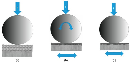 Test principle: (a) loading the dry-coated sample, (b) pre-rolling under load and subsequent compacting with movable mounted ball, (c) sliding test with fixed ball on compacted dry lubricant coating.