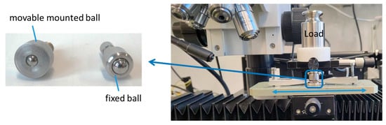 Setup for pre-rolling in milli tribometer: on the left, the movable mounted ball for the pre-rolling process and the fixed ball for sliding tests are shown.