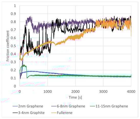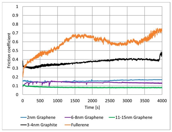 It is evident that the nano-graphite, 6–8 nm graphene platelets, and fullerene did not exhibit friction reduction under these test conditions. During the test, these dry lubricants were displaced from the contact area, leading to steel–steel contact and resulting in high friction. Conversely, in the case of the 2 nm graphene platelets and 11–15 nm graphene platelets, a film was formed, featuring a low coefficient of friction (COF). In these instances, a compact film could be established, while the other dry lubricants were removed from the raceway.