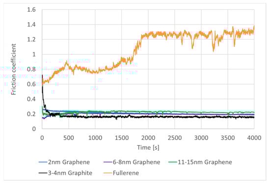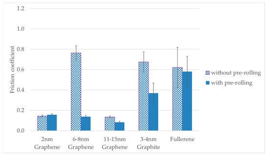 Friction coefficient on steel coated with graphene platelets, nano-graphite, and fullerene with pre-rolling, tested under 660 MPa.