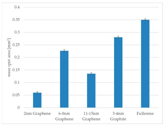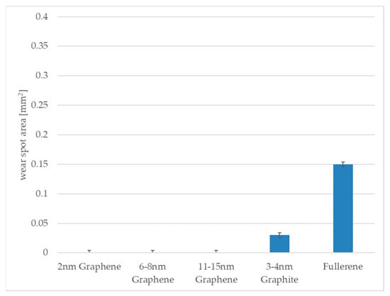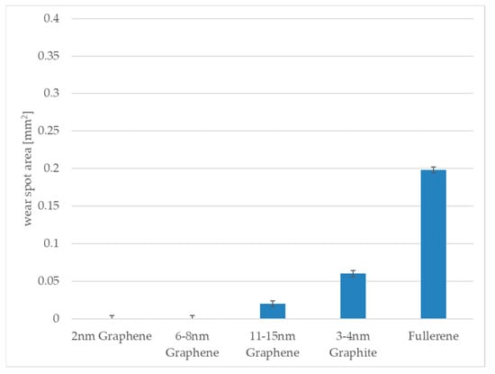 For the test with the pre-rolling process and investigation under a contact pressure of 660 MPa, Figure 9 shows the balls’ wear spots. It is significant that in all cases, the wear spot area is reduced. In the case of the graphene platelets, no wear could be measured.