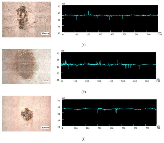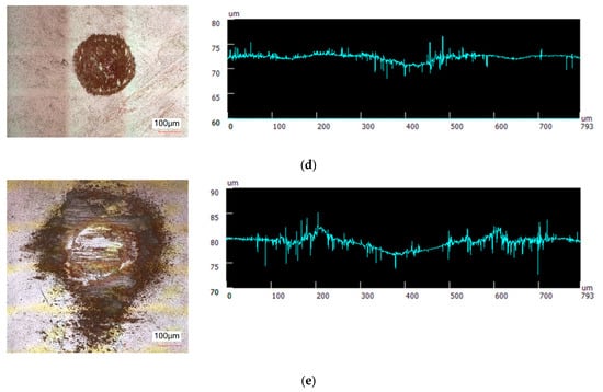 For the balls tested on the pre-rolled lubricant film under a higher load, the respective ball surfaces are shown in Figure 11. The tests under increased load show an increased wear volume and visualize the film formation, which provides a deeper insight into the positive and negative wear. The comparison of the wear spot area on the steel ball surface when using different types of lubricants proves the formation of a wear protective film by the graphene platelets. As depicted in Figure 11, under identical load (830 MPa contact pressure), speed, and track length conditions, the wear spot area on the steel ball surface is not visible or is smallest when using graphene platelets as a dry lubricant. Due to the graphene platelets, a black-colored zone on the contact point is visible with nearly no thickness. The figure reveals the surface image on the left and the respective profile on right in order to determine the ball wear. In comparison, the fullerene dry lubricant resulted in significant wear on the balls’ surface. Regarding nano-graphite, a slight amount of wear can be found on the surface. The steel ball using fullerene dry lubricant indicates the largest wear spot area, which is roughly consistent with the variation of the wear degree under microscope.