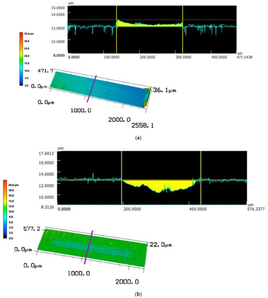 The respective dry-lubricated racetracks for the graphene platelet dry lubricant (6–8 nm graphene platelets) and fullerene are illustrated in Figure 13. The surfaces were analyzed by laser scanning microscopy. It can be seen that the graphene platelets form a dense film on the surface with a thickness of approx. 150 to 200 nm in the central contact zone. In contrast, for the fullerene on the surface, wear is evident, with the base material being removed to a depth of up to 2.5 µm.