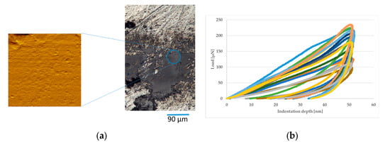 In the case of the compacted graphene platelet-based track, for the sample run with 6–8 nm thick graphene platelets, nanoindents were performed with an indentation depth of approx. 50 nm. For the measurements, a Bruker Hysitron TriboIndenter TI 950 (Bruker Corporation, Billerica, MA, USA) with a Berkovich tip was used. The compacted graphene film used for the measurements is shown in Figure 14a (on the left is the scanning probe image with measurement points, and on the right is a microscopic view of the surface) for the test performed under 660 MPa contact pressure. Figure 15a depicts the surface for the nanoindentation tests for a track that was pre-rolled and investigated under the contact pressure of 830 MPa. The load-displacement curves for the nanoindents are shown for the test at 660 MPa in Figure 14b and for the contact pressure of 830 MPa in Figure 15b. The scanning probe microscopy (SPM) images prove surface smoothening and a fine surface structure for both cases. A slightly higher hardness, as compared to the compacted graphene platelets on the angular contact ball bearings was achieved. A hardness of approx. 0.6 GPa and a Young’s modulus of approx. 30 GPa were achieved in both cases. The compacted graphene platelets feature elastoplastic material behavior (Figure 14b and Figure 15b). In the case of the higher contact pressure, the load-displacement curves feature less derivation.