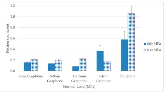 Friction coefficient on steel coated with graphene platelets, nano-graphite, and fullerene without pre-rolling, tested under 660 MPa.