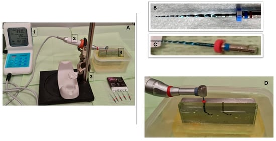 (A) Photo of the experimental set-up for testing the NiTi files’ cyclic fatigue showing: (1) the Endodontic Electric motor; (2) the handpiece fixed on a stand (3); and (4) the stainless-steel block with artificial canal. (B) RE files and (C) TTB files. (D) Files placed in artificial canals immersed in the irrigant.