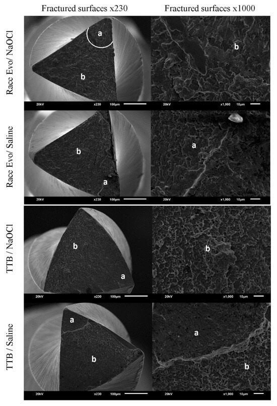 Scanning electron microscope photomicrographs of fractured surfaces of TTB and RE after cyclic fatigue resistance testing in NaOCl and saline at ×230 and ×1000 magnification. (a) shows an area of fatigue linear striations, while (b) presents dimpling and micro-voids characteristic of ductile fracture.
