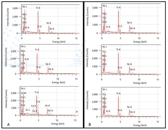 Additionally, the RE files exhibited the presence of zirconium (Zr). Previous studies have indicated that NiTi surface treatments involving Zr can result in smoother surfaces and improved resistance to metal fatigue [,]. The presence of Al and Zr in RE files may also explain why their cyclic fatigue resistance remained unaffected by NaOCl [].