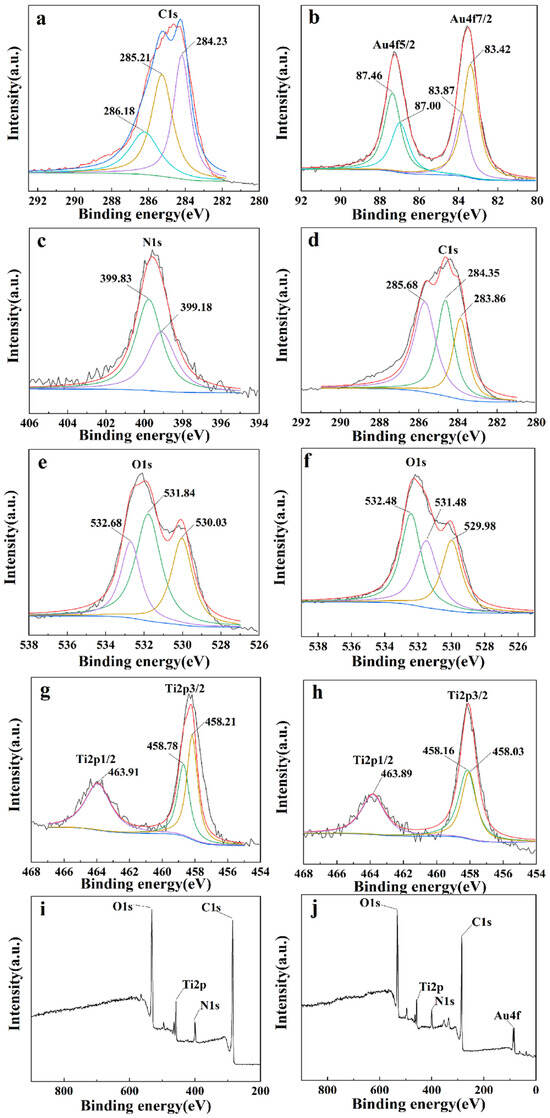 The high-definition XPS of (a) C1s, (c) N1s, (e) O1s, (g) Ti2p, and (i) XPS full spectrum of TNT@MPDA nanotubes. The high-definition XPS of (b) Au4f, (d) C1s, (f) O1s, (h) Ti2p, and (j) XPS full spectrum of TNT@MPDA@Au nanotubes.