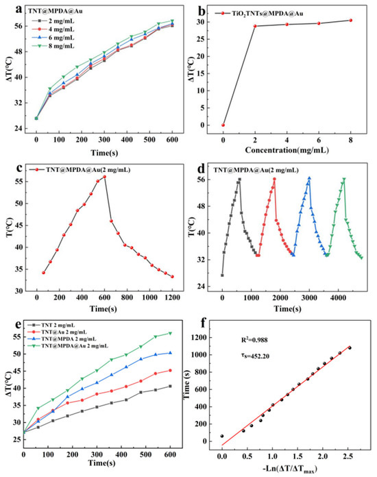 Temperature elevation of TNT@MPDA@Au nanotubes at various concentrations versus irradiation duration in 10 min (a). Temperature difference plots of TNT@MPDA@Au nanotubes with different concentrations of TNT@MPDA@Au nanotubes after irradiation with near-infrared light for 10 min (b). Temperature rise and temperature drop curves of the 2 mg/mL of TNT@MPDA@Au nanotubes (c). Dispersion Temperature Change of 2 mg/mL TNT@MPDA@Au nanotubes during 4 Cycles (The black curve and square dots represent the first loop, the red curve and rounded dots represent the second loop, the blue curve and square triangle represent the third loop, and the green curve and inverted triangle represent the fourth loop.) of near-infrared irradiation (on/off) (d). Temperature changes of TNT, TNT@Au, TNT@MPDA, and TNT@MPDA@Au nanotubes after 10 min of NIR irradiation at a concentration of 2 mg/mL (e). The relationship between cooling time and temperature driving force of TNT@MPDA@Au nanotubes (f).