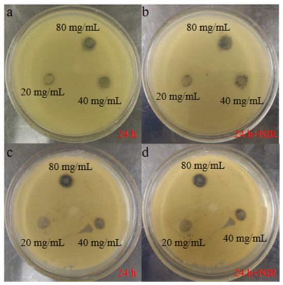 The 2 groups of bacterial suspensions were stirred at 37 °C for 16 h and then diluted to a concentration of 1 × 108 CFU/mL. After that, 30 μL of both sets of bacterial suspensions were added to the solidified agar Petri dishes, and the suspensions were well scraped on the dishes using a triangular applicator stick. The suspensions of TNT@MPDA@AuNPs with concentrations of 20 mg/mL, 40 mg/mL, and 80 mg/mL were slowly added dropwise to the filter paper. Finally, the Petri dishes were incubated in an incubator at 37 °C for 12 h to determine their antibacterial properties. After 24 h, the suppression ring was irradiated for 10 min using a near-infrared laser [50].