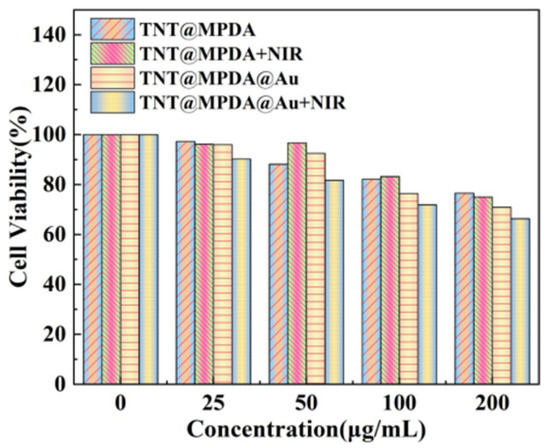 Generally speaking, the toxicity and biocompatibility of antimicrobial materials are required to be high. The cytotoxicity of 293T normal cells was tested by the CCK-8 method and the cell viability was determined. As shown in Figure 7, when the concentrations of TNT@MPDA nanotubes and TNT@MPDA@Au nanotubes were 200 μg/mL, the cell survival rates of normal cells, respectively, were 76.55% and 70.94%, indicating that the materials had good biocompatibility for normal cells. After NIR irradiation, the cell survival rate of TNT@MPDA nanotubes and TNT@MPDA@Au nanotubes against normal cells decreased to 75.03% and 66.36%, respectively. It could be clearly seen that the decrease in cell survival was not significant, indicating that the materials still had favourable biocompatibility after NIR. The above results demonstrated that normal cells were not greatly affected during in vivo and in vitro antimicrobial processes.