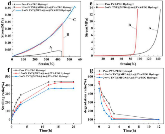 Antimicrobial hydrogel with similar mechanical properties to the skin facilitates skin wound repair, maintains the integrity of the material, and facilitates good adhesion when the skin tissue is deformed by external forces. As shown in Figure 8d, these hydrogels exhibited excellent tensile properties (434.2% to 547.6%) and were far superior to the mechanical properties of human skin (60% to 75%). The elongation at break increased from 434.24% (0 wt%) to 444.7% (1.5 wt%) and 547.6% (3 wt%) when the TNT@MPDA@Au nanoparticles were added from 0 wt% to 3 wt%. To assess the mechanical properties of these hydrogels, compressive stress–strain measurements were also performed. As shown in Figure 8e, the stresses of pure PVA/PEG hydrogels and TNT@MPDA@Au@PVA/PEG hydrogels (3 wt%) were 505.7 KPa and 11.8 MPa, respectively, when the strain was 95%. The compressive stress of TNT@MPDA@Au@PVA/PEG hydrogels (3 wt%) was significantly much higher than that of the pure PVA/PEG hydrogel, suggesting that the prepared hybrid hydrogels had more excellent compressive properties. The enhancement of the tensile and compressive properties was due to the denser 3D network structure of PVA/PEG with the addition of TNT@MPDA@Au nanoparticles. As a result, these hydrogels with mechanical properties superior to those of human skin were able to resist external forces without breaking, avoiding damage to underlying tissues better [18].