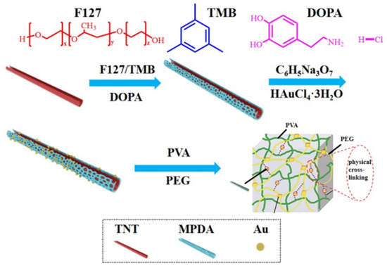 A total of 15 g of PVA was gradually added to 200 mL of distilled water and the resulting mixture was magnetically stirred at a temperature of 95 °C until a uniform and transparent solution was achieved. TNT@MPDA@Au nanotubes were incorporated into the PVA solution and subjected to stirring for 4 h [42,43]. Subsequently, 5 g of PEG was introduced into the solution, and the stirring process was sustained for 0.5 h. The obtained solution was transferred into a plastic mould, frozen at −20 °C for 8 h, subsequently thawed at room temperature for 4 h, and subjected to 3 cycles of freezing and thawing to yield composite hydrogels consisting of TNT@MPDA@Au@PVA/PEG [44].