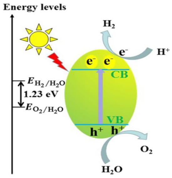 In this process, light energy is converted into chemical energy and electrons move from the valence band (VB) to the conduction band (CB), generating photogenerated electron–hole pairs. Photogenerated electron–hole pairs can drive photocatalytic half-reactions. The redox capability of a semiconductor depends on the highest energy state in the VB and the lowest energy state in the CB. The CB level must be more negative than the hydrogen production level (EH2/H2O) to catalyze the reduction of water to hydrogen, and VB must be more positive than the water oxidation level (EO2/H2O) to oxidize water in a relatively unfavorable four-hole process [31]. The minimum energy required to drive the reaction for two moles of incident photons is 1.23 eV. The efficiency of photocatalytic hydrogen generation from water splitting is relatively low due to the rapid recombination of photogenerated electron–hole pairs, the inability of many photocatalysts to utilize visible light, and the possibility of a reverse reaction that involves the rapid recombination of hydrogen and oxygen [32].