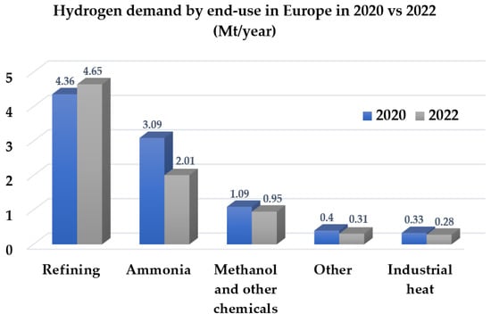 Hydrogen demand by end-use in Europe in 2020 vs. 2022 (Mt/year); based on [101].