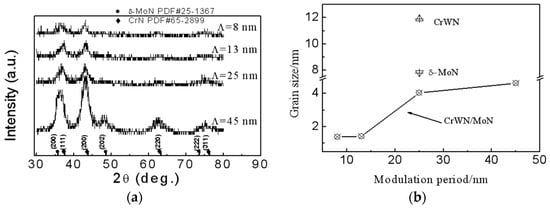 The XRD patterns of CrWN/MoN nano-multilayer coatings with different Λ (see the TEM results) and the peak positions of monolayer fcc-CrWN and hexagonal δ-MoN coatings are presented in Figure 1a, and the corresponding grain sizes of the multilayer and monolayer coatings are shown in Figure 1b. The CrWN/MoN coatings show a biphasic structure of fcc-CrWN and hexagonal δ-MoN. The diffraction peaks of CrWN/MoN coatings locates between the fcc-CrWN and hexagonal δ-MoN. When Λ is 45 nm and 25 nm, one can see the diffraction peaks of fcc-CrWN and hexagonal δ-MoN. When Λ decreases to 13 nm and 8 nm, the peaks of δ-MoN (202) and (222) disappear, as well as those of fcc-CrWN (220) and (311), which coincides with the TEM ring analysis for the same coating. As Λ decreases, the intensity of the diffraction peaks of the CrWN/MoN nano-multilayer coatings gradually decreases, and the peak of CrWN/MoN coatings near 36.5° shifts from the (200) peak of monolayer δ-MoN at 35.8° to the peak (111) of monolayer CrWN at 37°, which indicates possible structural and stress evolution in the layers of the coatings [25]. The crystallite size is estimated by the Debye–Scherrer formula [18]. The crystallite size of CrWN monolayer coatings is about 11–12 nm, while the values of MoN monolayer coatings are about 7–8 nm. With decreasing Λ, the grain size of CrWN/MoN nano-multilayer coatings decreases from 4–5 nm to 1.5 nm, which is lower than the size of monolayer CrWN and δ-MoN grains, as shown in Figure 1b. With decreasing Λ, the nano-multilayer structure shows broadened diffraction peaks, which means that the grains of CrWN/MoN coatings are inhibited [26].