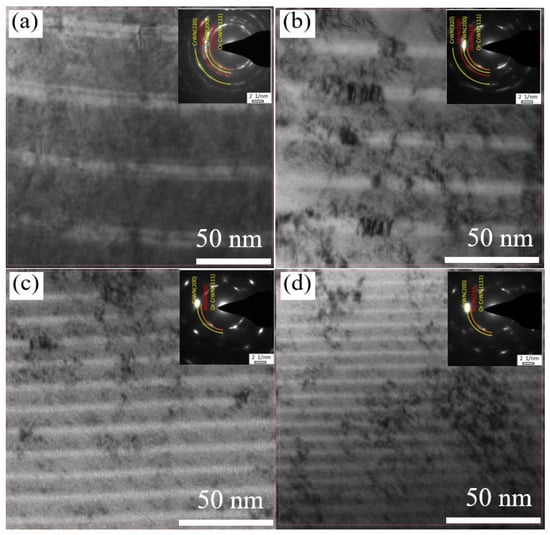 Cross-sectional TEM images and corresponding selection electron diffraction pattern of the CrWN/MoN nano-multilayer coatings with different modulation periods: (a) 45 nm, (b) 25 nm, (c) 13 nm, (d) 8 nm.
