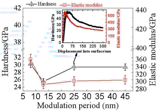 Figure 5 shows the hardness and elastic modulus of the CrWN/MoN nano-multilayer coatings with different Λ; the inset is the hardness and elastic modulus of the 25 nm Λ coating with displacement into its surface. With the displacement into 300 nm of surface, the hardness of the coating is about 29.6 Gpa while the elastic modulus is about 296.6 Gpa. With increasing Λ, the hardness of CrWN/MoN nano-multilayer coatings decreases from 30.2 GPa to 25.5 GPa and then increases to 29.5 GPa. In our previous studies, the hardness of CrN, CrWN and δ-MoN prepared by cathodic arc plating were 16–18 GPa [38], 19–20 GPa [39] and 20–21 GPa [38], respectively. The hardness of the CrWN/MoN nano-multilayer coatings reaches 30 GPa, which is also higher than that of the conventional monolayer TiN [40] and ZrN [41] coatings. This hardness enhancement of the CrWN/MoN nano-multilayer is mainly dependent on the nano-multilayer microstructure. Correspondingly, the Λ variation in the nano-multilayer leads to a similar variation trend of the elastic modulus. According to the sectional morphologies of the CrWN/MoN nano-multilayer coatings, as shown in Figure 2 (SEM) and Figure 3 (TEM), no obvious columnar crystals can be seen in the coatings. Therefore, the multilayer structure effectively inhibits the generation of columnar crystal structure and obtains the dense microstructure which is positive on hardness [42]. In addition, the growth of nanoscale grains can result in a significant hardness enhancement [43]. As shown in Figure 1b, with the decrease in Λ, the grain size decreases, which is useful for increasing the hardness of CrWN/MoN nano-multilayer coatings according to the Hall–Petch relationship [44]. As a result, the CrWN/MoN nano-multilayer coating with Λ = 8 nm has the maximum hardness and elastic modulus. However, the CrWN/MoN coating with 13 nm Λ has the minimum hardness, which can be attributed to interfacial structural changes, such as incoherent interfaces, as shown in Figure 4c″. In reference [45], Chen et al. observed that the hardness of CrAlN/TiN multilayer coatings with coherent interfaces and local coherent interfaces was higher than that of coatings with incoherent interfaces. Yalamanchili et al. observed that the hardness of TiN/ZrAlN multilayers with semicoherent interfaces was higher than that of coatings with incoherent interfaces [46]. As barriers to dislocation movement, the defects at interface boundaries and the coherency strain of the multilayer coatings are useful for hardness enhancement [47].