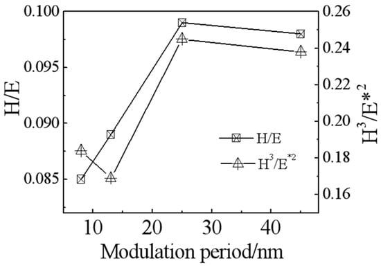 Figure 6 shows the calculated H/E and H3/E*2 ratios of CrWN/MoN nano-multilayer coatings at Λ values ranging from 8 nm to 45 nm, and H is the hardness of the coating, E is the elastic modulus, effective elastic modulus E* = E/(1 − v2), v is Poisson’s ratio 0.29. With increasing Λ, the H/E ratio of the CrWN/MoN nano-multilayer coatings increases from 0.078 to 0.09, while the H3/E*2 ratio decreases from 0.184 to 0.169, followed by an increase to 0.24. H/E follows a similar evolutionary trend to that of the COF and wear rate, as shown in Figure 7. Research shows that H/E and H3/E*2 are related to the toughness of hard coatings [48]. H/E is correlated to resistance to the elastic strain failure of the coatings, while H3/E*2 is related to the resistance to plastic deformation [49,50,51].