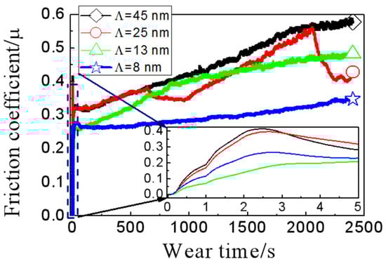 The interface plays a critical role in the coating’s mechanical properties, which have an important effect on the tribological properties [8]. A multilayer structure is a useful way to obtain an interface between two different material layers. The interface depends on the modulation period and crystal structure. The interfaces of the multilayer coatings can be optimized by adjusting the modulation period, while the crystal structure also plays a role. The optimal properties of the multilayer CrWN/MoN coatings must be the result of multiple effects, such as the Hall–Petch relationship and dislocation blocking.