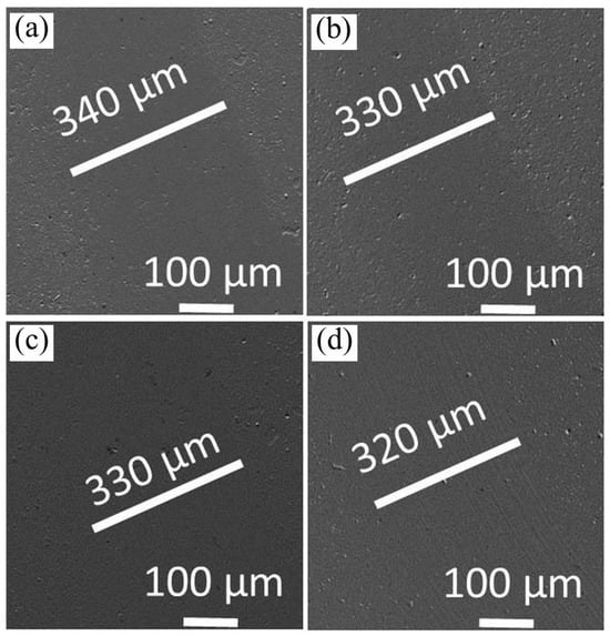 Figure 9 shows the wear morphologies of CrWN/MoN nano-multilayer coatings with different Λ from 8 nm to 45 nm. There are no tensile cracks of any type and/or spallation on the wear tracks of these coatings. The wear is slight, the wear surfaces are smooth, and there is no obvious debris at the edges of the wear tracks, but there are obvious pits and shallow furrows on the wear tracks. During the wear process, large particles fall off and form pits on the surface of wear. After large particles fall off, they are broken into small abrasive particles between the friction pair. Small abrasive particles play a pushing or cutting role in friction to form furrows on the wear track. The main wear mechanisms of CrN under dry friction are abrasive wear and adhesive wear [53,54], and there are a lot of debris and deep furrows at the edge of the wear track. MoN is introduced into CrWN coatings to form CrWN/MoN nano-multilayer coatings, and the wear mechanism is mild abrasive wear, which is evident from the wear morphology. During the friction process, tribochemical reactions may occur to form thin lubricating WO3 and MoO3 layers [55,56,57], which play the role of solid lubricants, significantly improve the wear resistance of the coating and reduce the damage degree of abrasive wear to the coatings, and only shallow furrows appear. At the same time, the nanometer multilayer structure improves the hardness of the coatings and also promotes the wear resistance of the coatings.