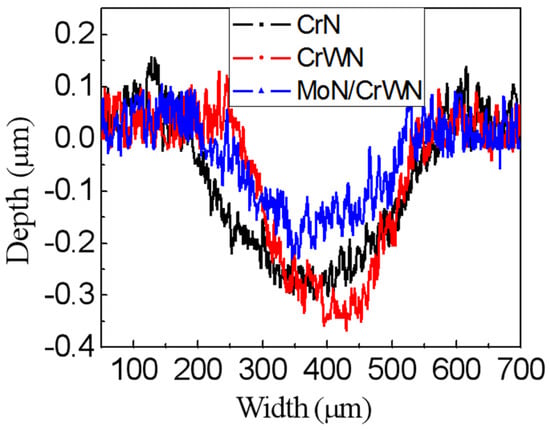Profiles of wear tracks of CrN, CrWN and CrWN/MoN nano-multilayer coatings.
