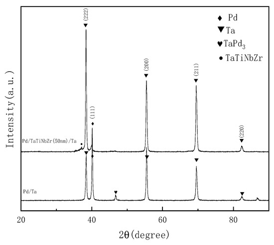 - A layer of TaTiNbZr was inserted between a Ta substrate and a Pd film as a barrier layer. No TaPd3 was produced after the hydrogen infiltration experiment at 600 °C, indicating that TaTiNbZr can effectively block the mutual diffusion of Ta and Pd.