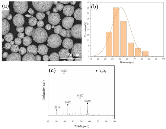 Figure 1a is the image of the powder taken by scanning electron microscope (SEM), and Figure 1b is the particle size distribution of the powder. The particle size of the powder predominantly ranged from 20 to 50 μm and was either spherical or ellipsoidal in shape. Phase analysis was conducted using an X-ray diffractometer (XRD, Rigaku Ultima IV, Tokyo, Japan) with a copper target and Kα-ray radiation. The test conditions were set at a power of 40 kW and a current of 30 mA, with a scanning speed of 5 degrees per minute and a diffraction angle range of 10 to 90 degrees for the X-ray diffraction of the Y2O3 powder. As shown in Figure 1c, the (211), (222), (400), and (622) crystal planes corresponding to the body-centered cubic phase (bcc) were obtained by calibration.