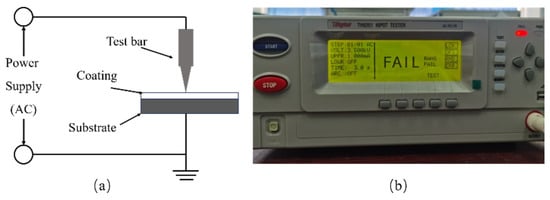 Figure 2 was a schematic diagram of the breakdown voltage test principle and insulation tester. The ground terminal was connected to the substrate and the test bar was set atop the coating. An AC voltage was then applied incrementally at 500 V/s until the breakdown voltage was reached. At this point, the voltage application ceased. Upon breakdown, an audible alarm from the insulator signaled, and a “FAIL” message appeared on the interface display. The dielectric strength was calculated by dividing the breakdown voltage by the coating thickness.