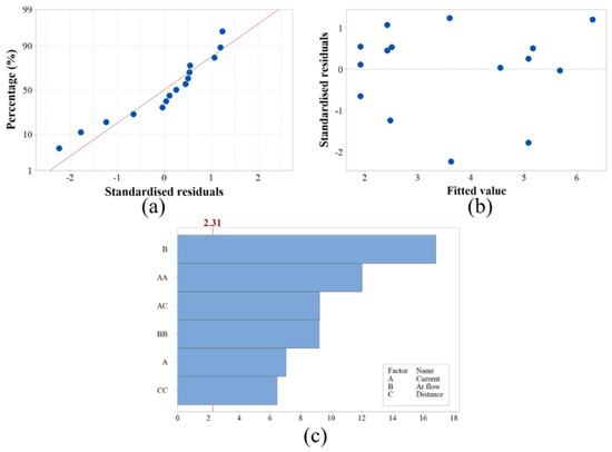 As shown in Table 4, the p-value of the model was 0.118 > 0.05, indicating that the model was not out of fit. For the model of the primary term, the p-value of current was 0.01 < 0.05, the p-value of Ar flow rate was 0.00 < 0.05, and the p-value of spraying distance was 0.871 > 0.05, so the p-value of current and Ar flow rate was less than 0.05, is the main influencing factor of the porosity of the coating, and the influence of current (C) was more significant. For the interaction term model, the p-value of the interaction term of current and spraying distance was less than 0.05, and the F-value was 69.65, which was much larger than that of the other two interaction terms, indicating that the interaction term of current and spraying distance played the most important role. Figure 3 shows the residual plot analysis of the experiment. As can be seen from Figure 3a, the residuals were clustered around the fitted line, which was consistent with the predicted values and was in accordance with the law of normal distribution. Figure 3b showed that the residuals fall on both sides of the zero, and there was no “V” trend, showing a random distribution. Figure 3c was a Pareto plot with the absolute values of the normalized effect for each factor in descending order. Among them, the current, the square term of the current, the square term of the Ar flow, the square term of the Ar flow, the interaction term of the current and the spraying distance, and the square term of the spraying distance were above the effective line, and only the spraying distance alone had no significant effect on the model.