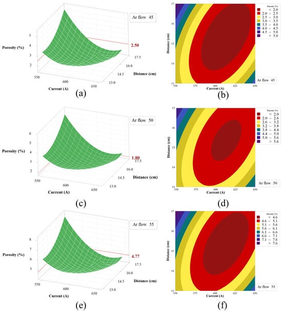 Surface plots and contour plots of the response of spraying distance and current to porosity at different Ar flow rates, (a) response surface plot of porosity at Ar flow rate 45 L/min, (b) contour plot of porosity at Ar flow rate 45 L/min, (c) response surface plot at Ar flow rate 50 L/min, (d) contour plot at Ar flow rate 50 L/min, (e) response surface plot at Ar flow rate 55 L/min, (f) response surface plot at Ar flow rate 55 L/min.