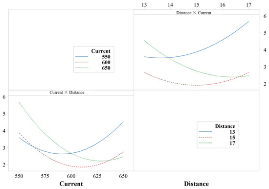 As shown in Figure 4a,c,e, when the interaction term of current and spraying distance remains constant, with the increase in Ar flow, the porosity of the coating first increased and then decreased, and the maximum porosity was 6.48% when the Ar flow rate was 55 L/min. The minimum porosity was 1.80% when the Ar flow rate was 50 L/min. When the spray distance and current change synchronously, the change in porosity is not described simply by increasing or decreasing. However, there was an optimal area for the interaction of current and spray distance, corresponding to the highest point of each response surface. As shown in Figure 5, the interaction of porosity coincides with the analysis described above.