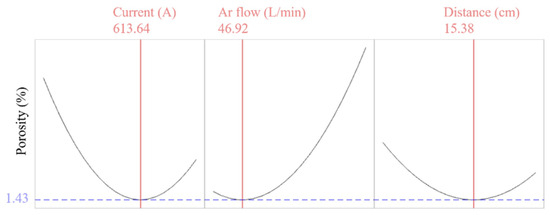 The effect of the current and spray distance interaction terms on the porosity of the coating was more complex. For example, the porosity was 2.50% when A was 45 L/min, D was 13 cm, and the current was 600 A. The porosity was 3.27% when the Ar flow rate was 45 L/min, the current was 550 A, and the spraying distance was 15 cm. Therefore, it showed that when the current and spraying distance were changing synchronously, the change in porosity was not described by simply increasing or decreasing. Nevertheless, an optimal interplay between current and spray distance was identified, corresponding to the nadir on each response surface as depicted in Figure 4a–c. The lowest value of the corresponding coating porosity was close to 1.43%. Finally, the surface response method was used to analyze the porosity, and the response of the porosity was optimized by software, as shown in Figure 6.