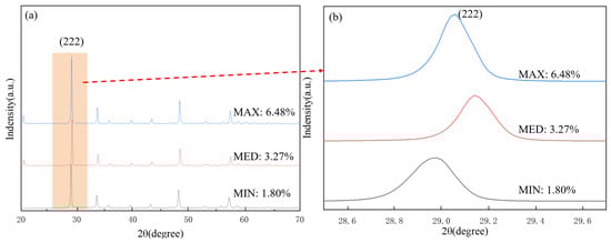 In Figure 7, it can be seen that the strongest diffraction peak for all Y2O3 coatings was the (222) crystal plane diffraction peak of around 2θ = 29°. As shown in Figure 7b, combined with the experimental data in the previous article, the porosity of the coating samples with the largest, medium, and smallest porosity was taken as an example: 3 (MAX), 1 (MED) and 14 (MIN) samples were 6.48%, 3.27%, and 1.80%, respectively.