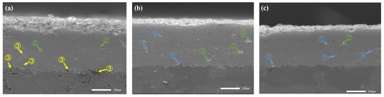 It has been found that the different proportions and numbers of porosity and cracks in each type have an impact on the performance of coatings. Chen et al. [27] investigated the relationship between pore characteristics and coating bond strength. Their findings demonstrated a clear inverse relationship: as porosity levels diminished, the bond strength of the coating correspondingly increased. This suggests that a reduction in porosity enhances the overall integrity and adhesion of the coating. With the change of APS process parameters, the pore size and crack direction were classified in this study, and the pore diameter below 10 μm was regarded as type ①, the pore diameter of 10–25 μm was regarded as type ②, and the pore diameter was more than 25 μm as type ③. As shown in Figure 8c, MIN was mainly of type ①, and the porosity was 1.80%. Figure 8b MED was dominated by ① and ② types, with a porosity of 3.27%, and the porosity was mainly affected by the interaction between the current and the spraying distance, and, when the current was small and the spraying distance was large, the difference in the thermal expansion coefficient between the coatings caused the cooling stress to increase, which was closely related to the difference in the thermal expansion coefficient and the residual stress of the coatings [28]. Stress increased the generation and propagation of microcracks in the coating, which increased the porosity to a certain extent. The residual stresses due to this cooling varied depending on the process parameters of the coating and the enhanced resistance to crack propagation in the coatings. It has been reported that the decreased grain size can effectively hinder the rapid propagation of the cracks, especially since the determination of crack propagation paths was strongly related to the grain size. Decreased grain had a higher brittle crack extension resistance to release the applied strain energy. This reflected that the crack propagation rate of the fine grains was lower than that of the coarse grains, which was caused by the propagation behaviors of the cracks. In fine grains, the crack propagation was easily blocked by the grain boundaries, especially the grain boundary triple junction. Therefore, the crack propagation rate of the fine grains was much lower than that of the coarse grains, which could be beneficial to the enhancement of the cohesion strength of the coating. If there is a significant difference in the coefficient of thermal expansion between the particles and the substrate material, they will expand and contract at different rates when cooled and heated at various temperatures. This mismatch can lead to increased stress between the coating and the substrate, which may result in the formation of cracks or pores in the coating. Partially melted particles are compressed when sprayed onto the substrate surface. If the surrounding particles cannot flow sufficiently to fill the gaps, tiny pores will form within the coating. These pores, ranging in size from approximately 10 to 25 μm, can affect the porosity and mechanical properties of the coating. Figure 8a MAX is dominated by ③ and ④ types, with a large porosity of 6.48%; at this time, there were more unmelted particles in the coating, and large pores appeared when the layers were tiled above the unmelted particles.