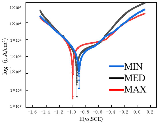 The self-corrosion potential of the MAX, MED, and MIN coatings was tested, and the dynamic potential polarization curves of the Y2O3 coating prepared with different parameters were shown in Figure 9, and the data of corrosion potential Ecorr and corrosion current density Icorr were obtained by fitting the polarization curves according to the Stern–Geary formula [29], and the self-corrosion potential of the coating shifted positively as the porosity decreased, as shown in Table 6.
