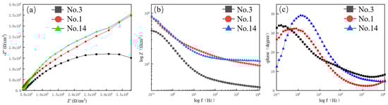 Y2O3-coated specimens No. 3, 1, 14, (a) Nyquist plot, (b) Bode impedance plot, (c) Bode phase plot.