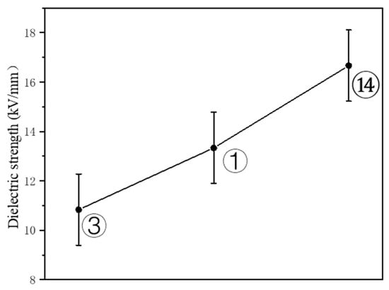 As depicted in Figure 11, there is a clear trend showing that a lower porosity in the coating correlates with a higher dielectric strength. Specifically, the dielectric strength of the specimen with minimum (MIN) porosity reached 16.67 kV/mm, which is 53.92% higher than that of the specimen with maximum (MAX) porosity, at 10.83 kV/mm. When examining the porosity and types of cracks presented in Figure 8, it becomes evident that optimizing the spray process parameters can considerably reduce the coatings’ porosity and enhance their dielectric strength. The fundamental mechanism behind the dielectric breakdown of coatings is a combination of corona discharge and thermal breakdown. Discharges in internal defects cause localized corrosion, while an imbalance between the heat produced and dissipated within the coating results in permanent damage [31]. By minimizing defects and cracks within the coating, the number of conductive paths is reduced, thereby increasing the dielectric strength of the coating and enhancing its insulative performance.