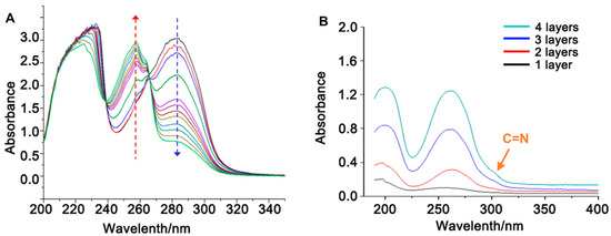 As shown in Figure S2D, UV-vis spectroscopy of 4-pyridinecarboxaldehyde exhibits two absorption bands. The peak between 240 nm and 260 nm (ε = 2000) corresponds to the π→π* transition, which is similar to benzene. To further demonstrate the success of the synthesis of BP, BBr was added dropwise into 4-pyridinecarbaldehyde, and its dynamic UV-vis spectrum was recorded every 5 s to evaluate the synthesis process. As shown in Figure 1A, the peak intensity of the aldehyde group at 285 nm gradually decreases, while the peak intensity of the newly formed ester bond at 255 nm gradually increases, demonstrating the successful synthesis of the new BP. The UV-vis absorption curve reveals that the peak positions of the BP material are at 225 nm and 255 nm. As depicted in Figure 1B, the peak shape and position of the assembly have not changed. The linear increase in the intensity of the ultraviolet absorption peaks at 225 nm and 255 nm is due to the increased number of modification layers. In addition, the peak of the newly formed Schiff base bond at 305 nm [32] indicates the feasibility of using LbL self-assembly to study GCBP. The above results demonstrate the successful self-assembly process.