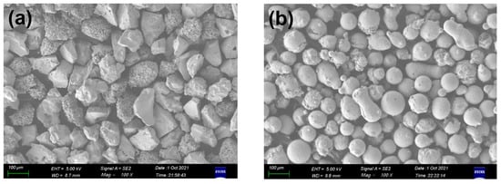 Aluminum blocks and iron powder (CISRI, Beijing, China) were melted in a vacuum furnace at 1900~2000 °C for 1 h and then atomized into powder. The morphology of the two powders is shown in Figure 1.