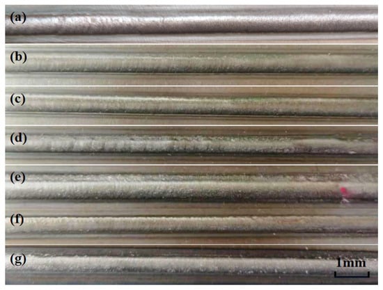 Macromorphology of the cladding layers after forming with different processes. (a) The optimal forming process; (b) a scanning speed of 0.003 m/s; (c) a scanning speed of 0.004 m/s; (d) a laser power of 1.8 kW; (e) a laser power of 2.6 kW; (f) a powder feed rate of 0.429 kg/h; and (g) a powder feed rate of 0.966 kg/h.